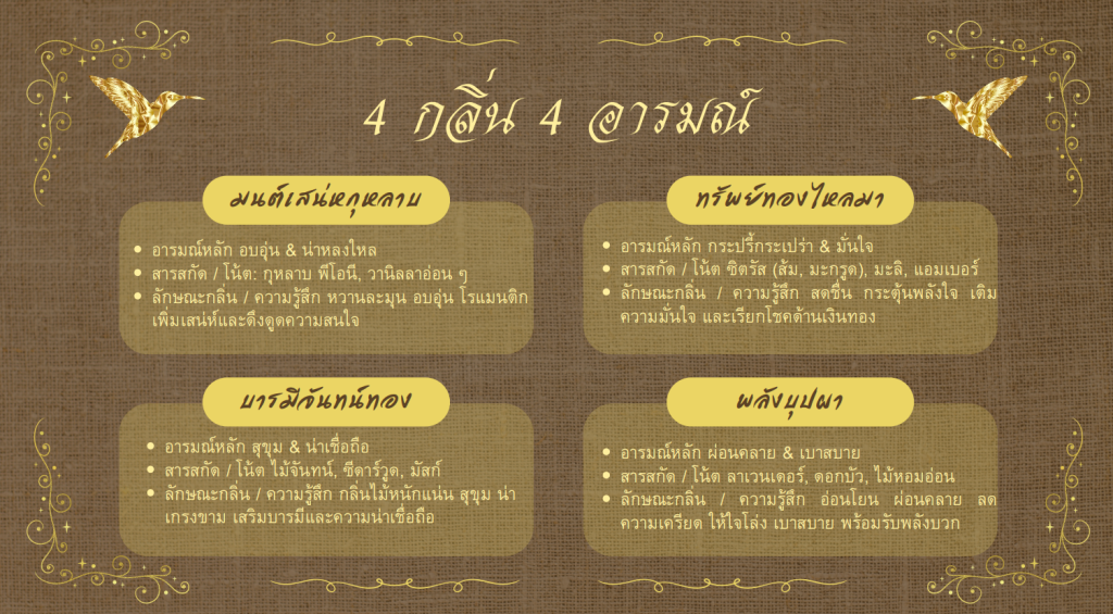 บารมีจันทน์ทอง กลิ่นไม้จันทน์และมัสก์ ให้ความรู้สึกสงบ หนักแน่น น่าเชื่อถือ เหมาะสำหรับผู้ที่ต้องการเสริมบารมี การเจรจา การงาน และความเคารพจากคนรอบข้าง